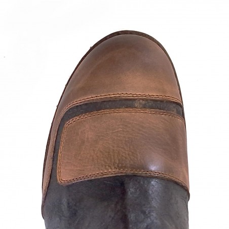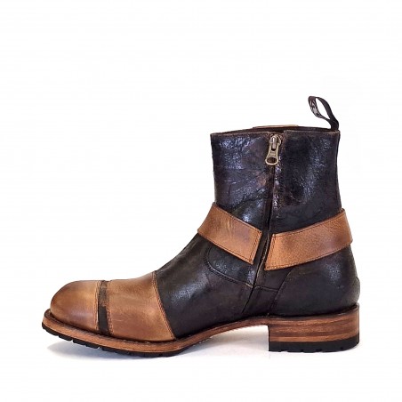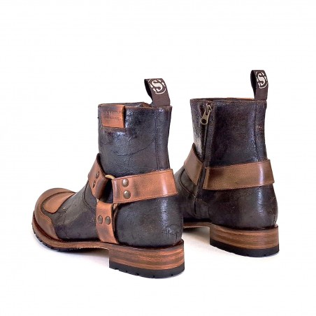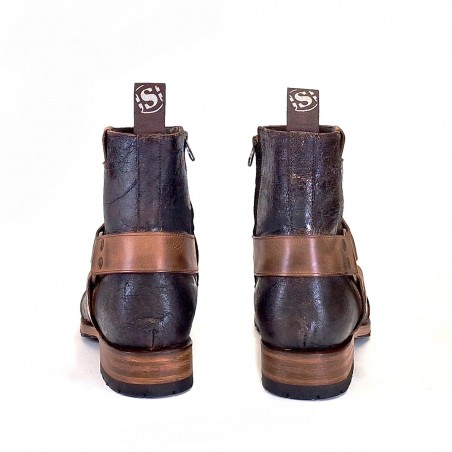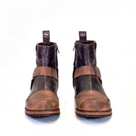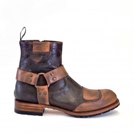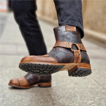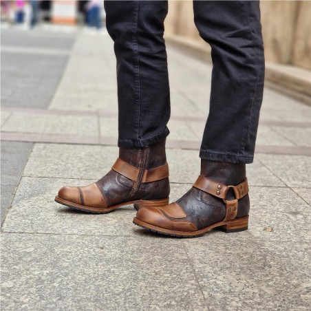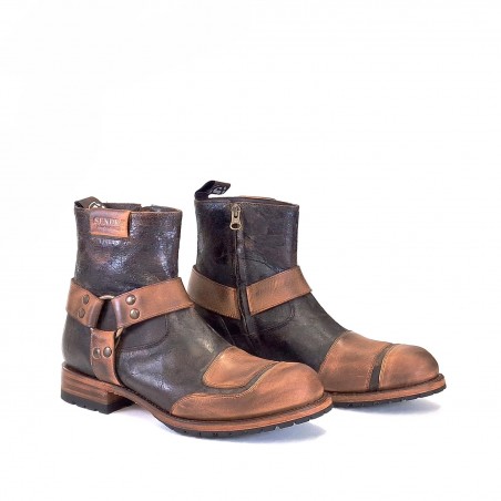 Botín de Sendra estilo Biker para hombre, que fusiona dos tipos de pieles en tonos marrones, una más clara en tono miel y otra más oscura con efecto vintage. Cuenta con un arnés decorativo y dos piezas de refuerzo en cuero, que le dan robustez y un toque muy distintivo a la bota.