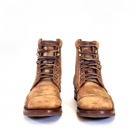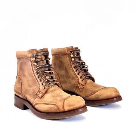 Botín de Sendra de cordón para hombre, fabricado en piel marrón engrasada con un acabado cepillado que le da el efecto de envejecido. Refuerzos en puntera, lateral y talón. Cordones de cuero.