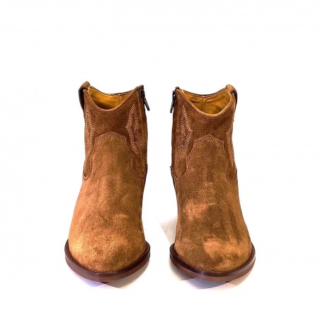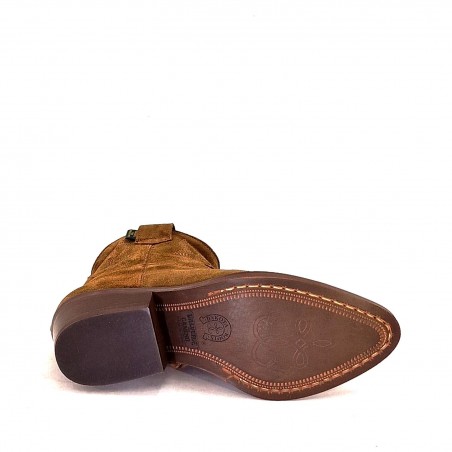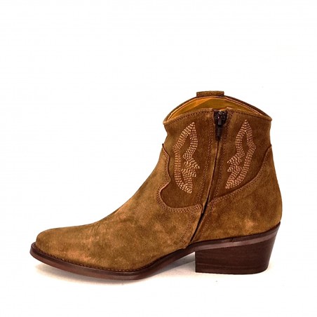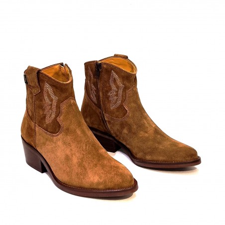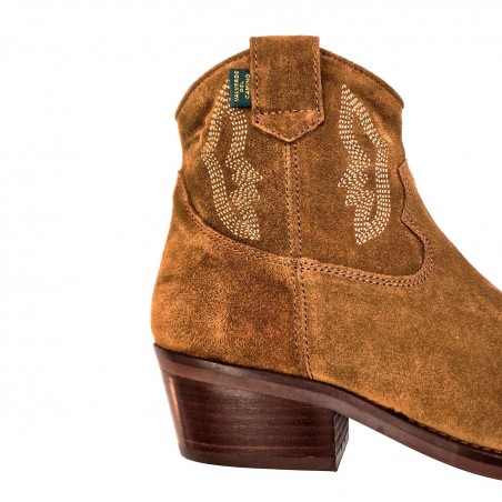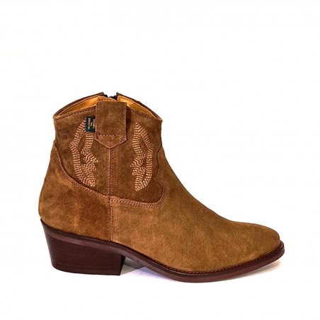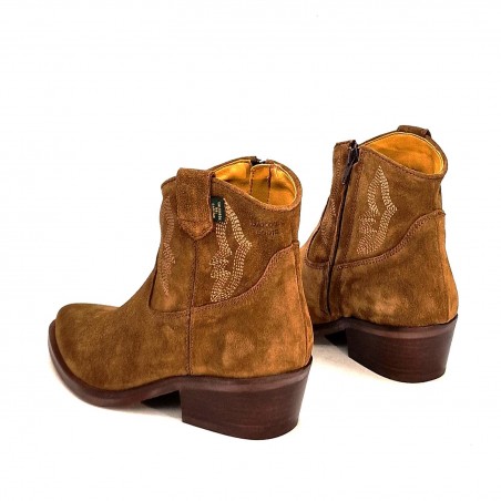 Botín campero para mujer de DAKOTA, procedente de Valverde del Camino. Diseñado con un estilo campero cowboy cuenta con bordados al tono, en la caña del botín.