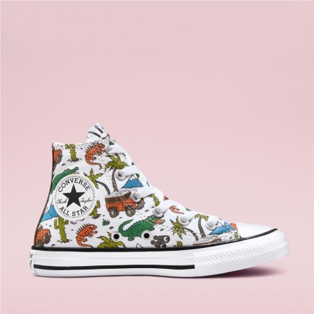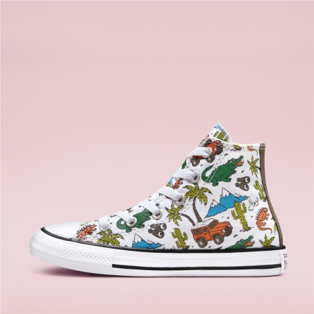 El icónico diseño de corte alto se prepara para explorar con un colorido estampado inspirado en el desierto. Ilustraciones de vehículos todoterreno, caimanes y más sirven como telón de fondo para las aventuras.