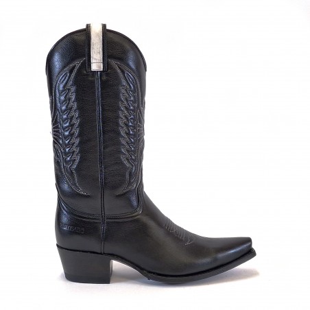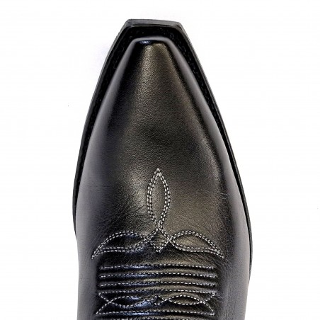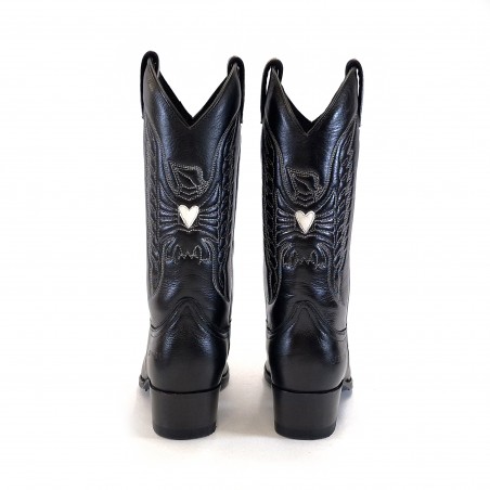 Bota cowboy de Sendra para mujer, de piel negra con bordados en blanco con el clásico diseño western en el empeine y águilas en la caña. Además tiene detalles insertados en piel blanca en los tiradores laterales y corazones en el centro de la caña lo que le da un toque especial a la bota. Cuenta con un cómodo tacón semicubano de 4,5cm de altura y horma acabada en una elegante puntera. La favorecedora caña cowboy hace unos 27.5cm de altura.