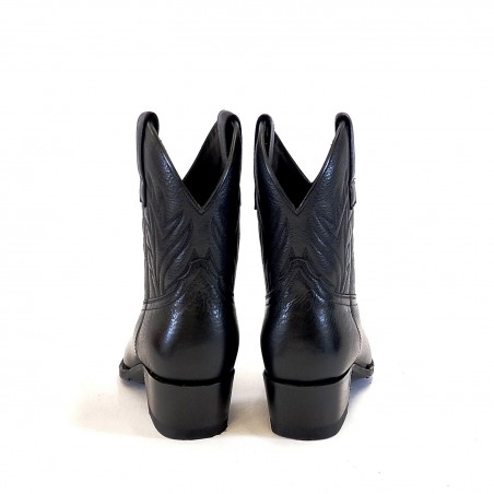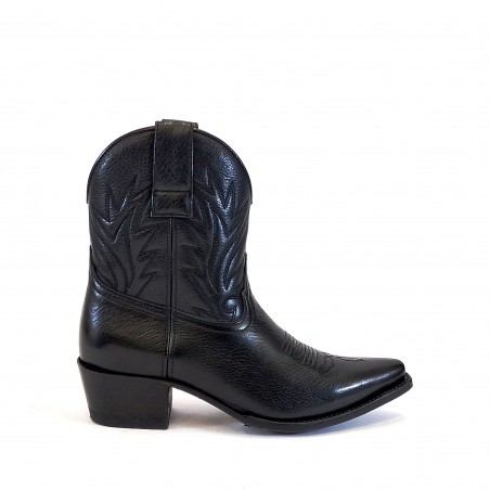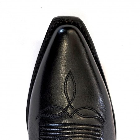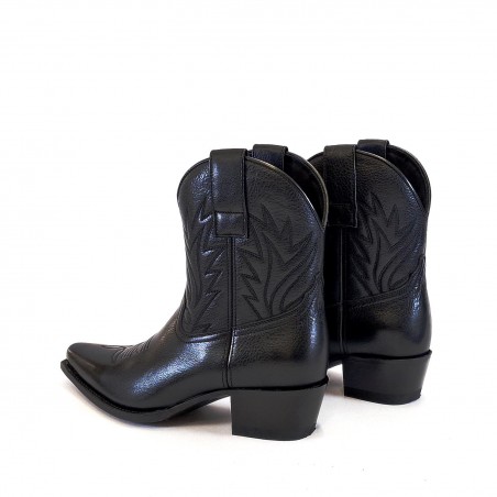 Increíble botín cowboy de Sendra para mujer. Esta bota de caña baja está fabricada en piel negra, con tacón de 4cm de altura, decorada bordados en relieve en la caña, y el bordado clásico western en el empeine.