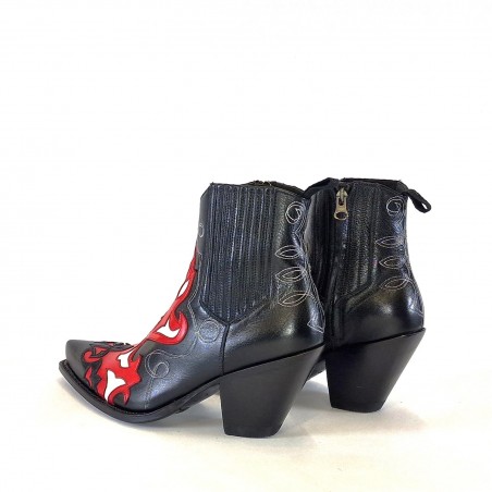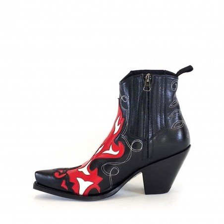 Botín de Sendra para mujer estilo cowboy en piel negra decorada con calados en piel roja y blanca efecto fuego en el empeine. Además va decorada con bordados en blanco en caña y talonera. Con un tacón de 7,5 cm