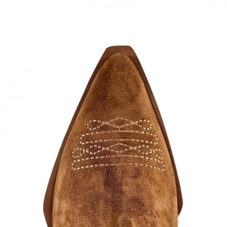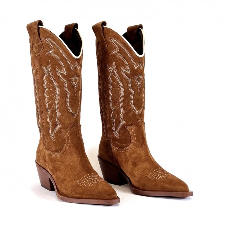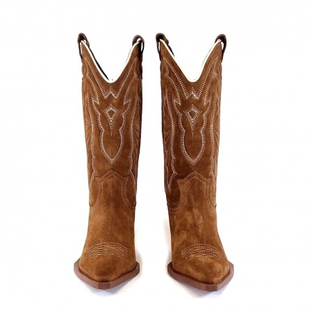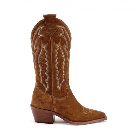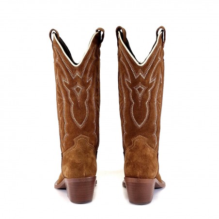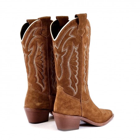 Bota estilo cowboy para mujer de serraje marrón de primera calidad. Está decorada con bodón y bordados contrastados en tonos beige que le aportan un elegante relieve y hacen esta bota tan especial.