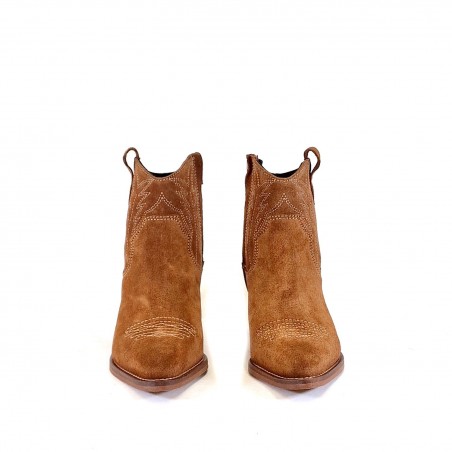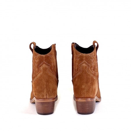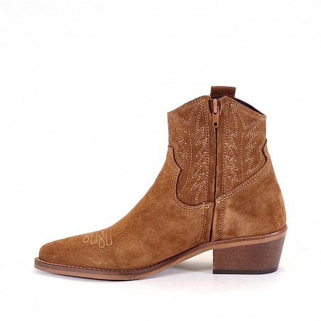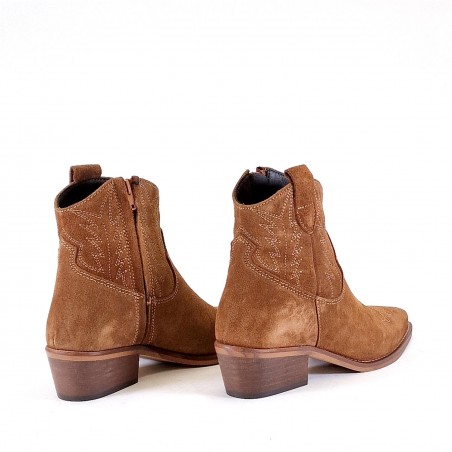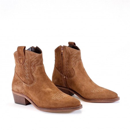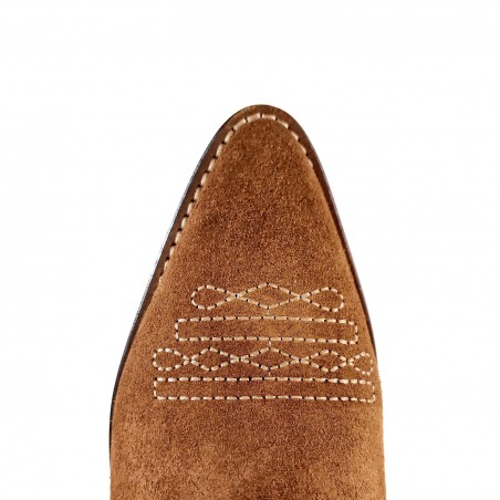 Botín de estilo cowboy, fabricada en piel de serraje de primera calidad. Bordados al tono en la caña y caña de la bota.