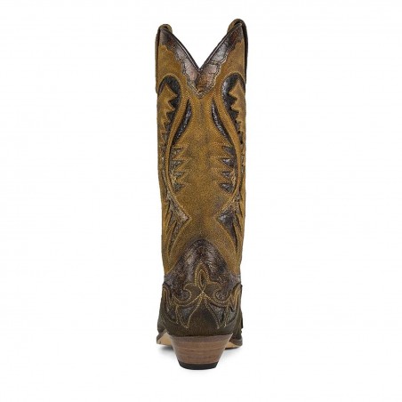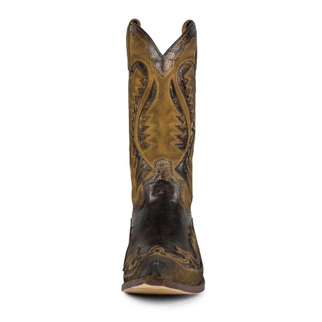 Bota cowboy de caña alta de Sendra para hombre, en tonos marrón suave de serraje y marrón oscuro brillante, dos pieles que combinan a la perfección. Bordados en la caña y empeine. Con un tacón cubano de 4,5 cm y tiradores en los laterales para mayor comodidad en la puesta.