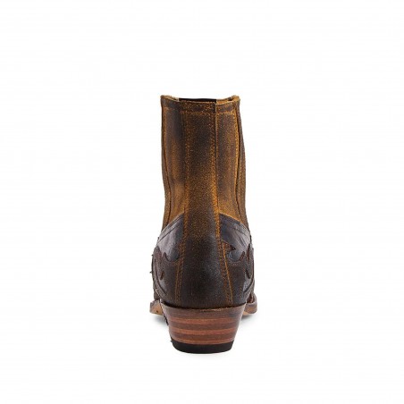 Botín cowboy de Sendra Cuervo, fabricado en dos pieles distintas, fusionando serraje marrón claro y piel en marrón oscuro con un acabado vintage, creando un contraste perfecto de colores entre la pieza de refuerzo de la parte inferior del botín y el resto de la bota.