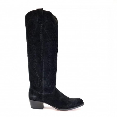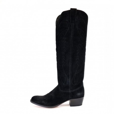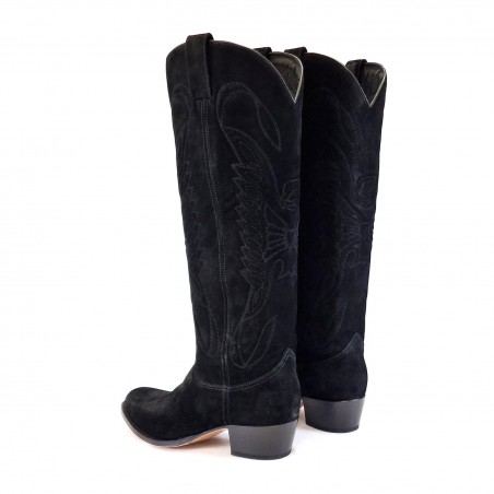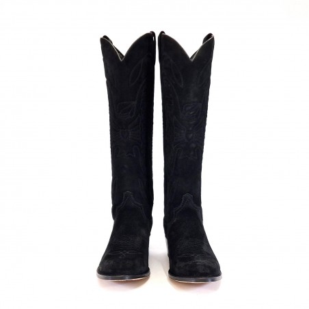 Bota alta de Sendra para mujer, fabricada en serraje negro premium y decorada con bordados en relieve en la caña y el empeine. Como suele ser habitual en esta gran marca, la suela es de cuero. Esta elegante bota western tiene una horma muy cómoda, con una puntera acabada redondeada .
