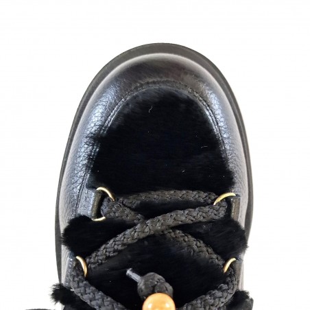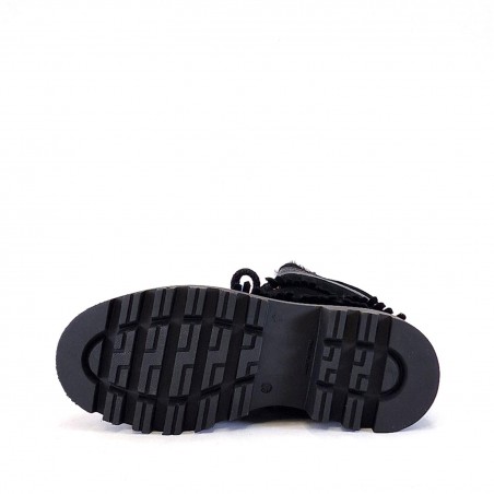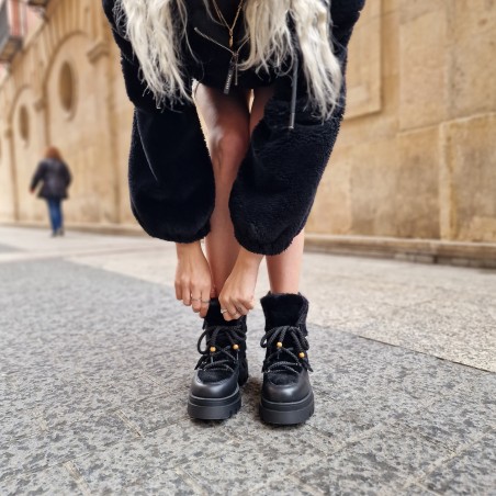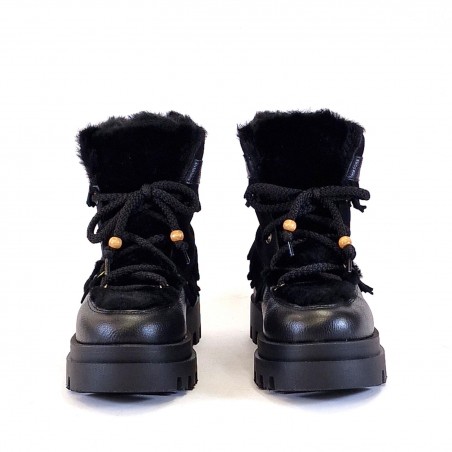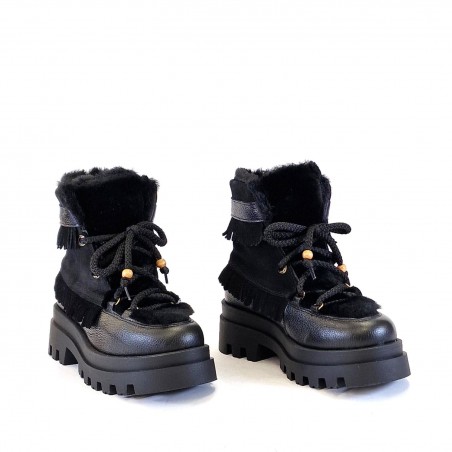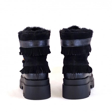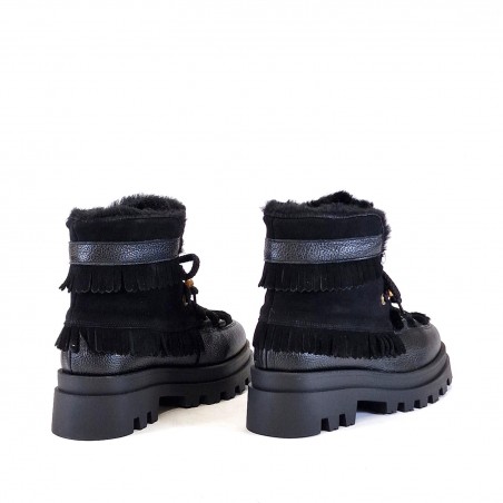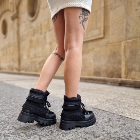 Piel y serraje en negro, con cierre de cordones al tono  y bolitas de madera al final del cordón. Decorado con mini flecos en la caña y lengüeta de pelo, hace a esta bota tan especial.