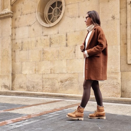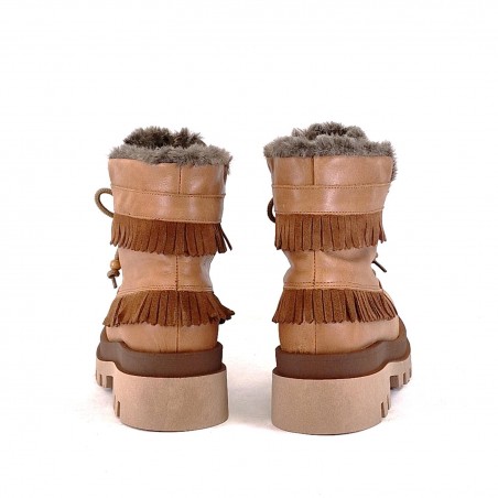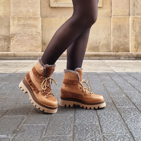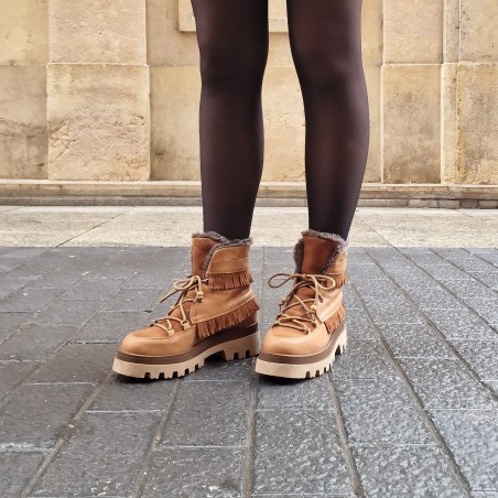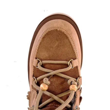 Cuero y serraje en tono marrón, con cierre de cordones al tono. Decorado con mini flecos en la caña y bolitas de madera al final del cordón, hacen a esta bota tan especial.