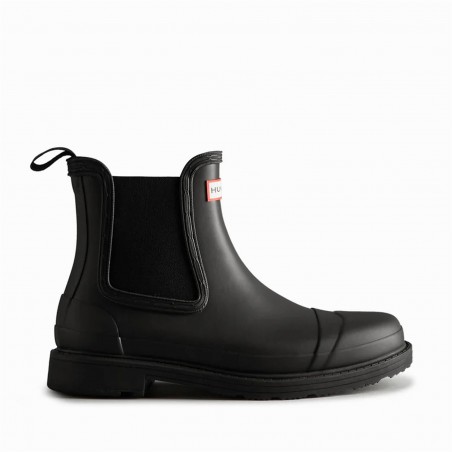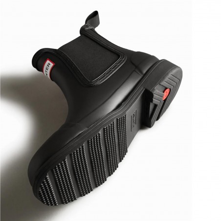 Bota baja de agua tipo chelsea de color negro de la prestigiosa marca HUNTER, con tirador en la parte posterior de la bota para una fácil puesta.