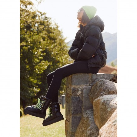Estas botas negras cuentan con un tejido de alta calidad. Su doble piso aporta mayor ligereza y aislamiento. Sus cordoneras trail multiposición de color verde fosforito permiten una sujeción óptima y cuentan con remaches reforzados. Además en la parte superior de la bota tiene otro cierre extra para mayor sujeción.