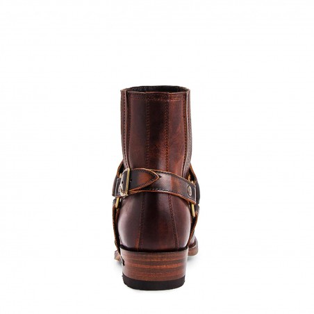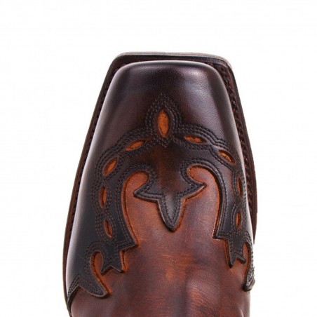 Este botín unisex de Sendra combina dos tipos de piel de la máxima calidad en dos tonos distintos de marrón, lo que hace destacar la pieza de refuerzo de la puntera que la hace tan especial. Decorada con un arnés extraible en el empeine con la clásica águila de la marca, su puntera cuadrada y tacón semicubano (de 3.5cm de altura) mezcla a la perfección el estilo biker con un toque cowboy western.