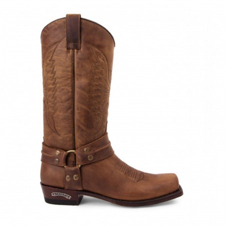 Bota de Sendra unisex de piel engrasada en color marrón. Decorada con un arnés en el empeine, su puntera cuadrada y tacón semicubano (de 3.5cm de altura) mezcla a la perfección el estilo biker con un toque cowboy western.
