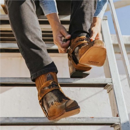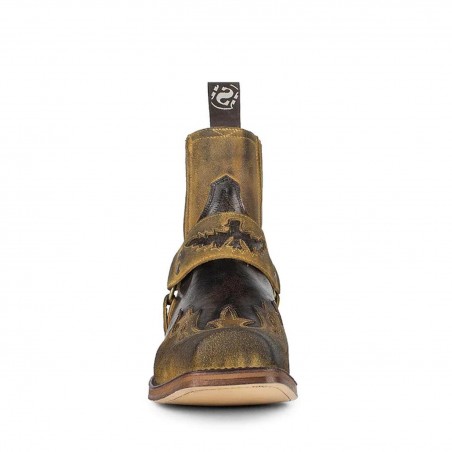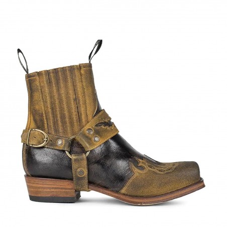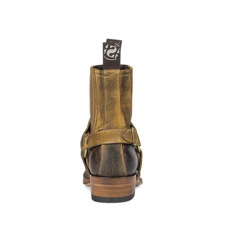 Botín de Sendra para hombre de puntera cuadrada de estilo biker o motero, con recosido en la punta, combinando serraje marrón claro y piel en marrón oscuro con un acabado vintage. Arnés extraible con hebilla para que puedas quitarlo y ponerlo a tu gusto. Cuenta con elásticos laterales a ambos lados de botón y con dos tiradores (textil marrón con el logo de la marca) situados en la parte superior, para mayor facilidad en la puesta.