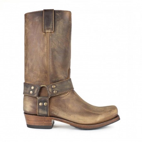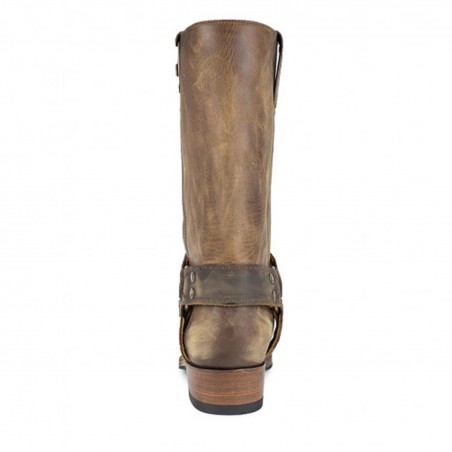 Bota biker de Sendra de piel marrón engrasada, con arnés lateral, puntera cuadrada y un tacón casi recto de 3.5cm de altura. Un modelo clásico y atemporal perfecto para el día a día por su comodidad y calidad.