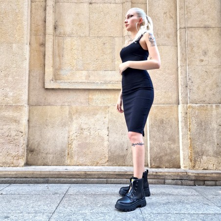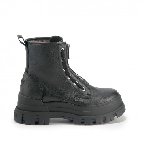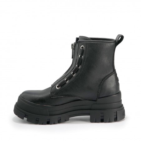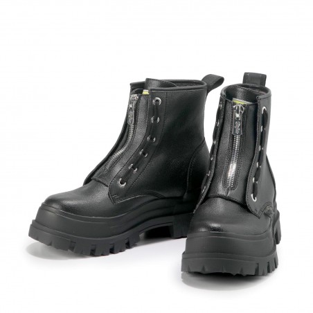 Esta bota de estilo militar totalmente negra está prepara para usarla con cualquier estilo. Los cordones rodean el llamativo cierre de cremallera en la parte delantera. Asegúrate de ganar todas las batallas de la moda usando esta bota.
